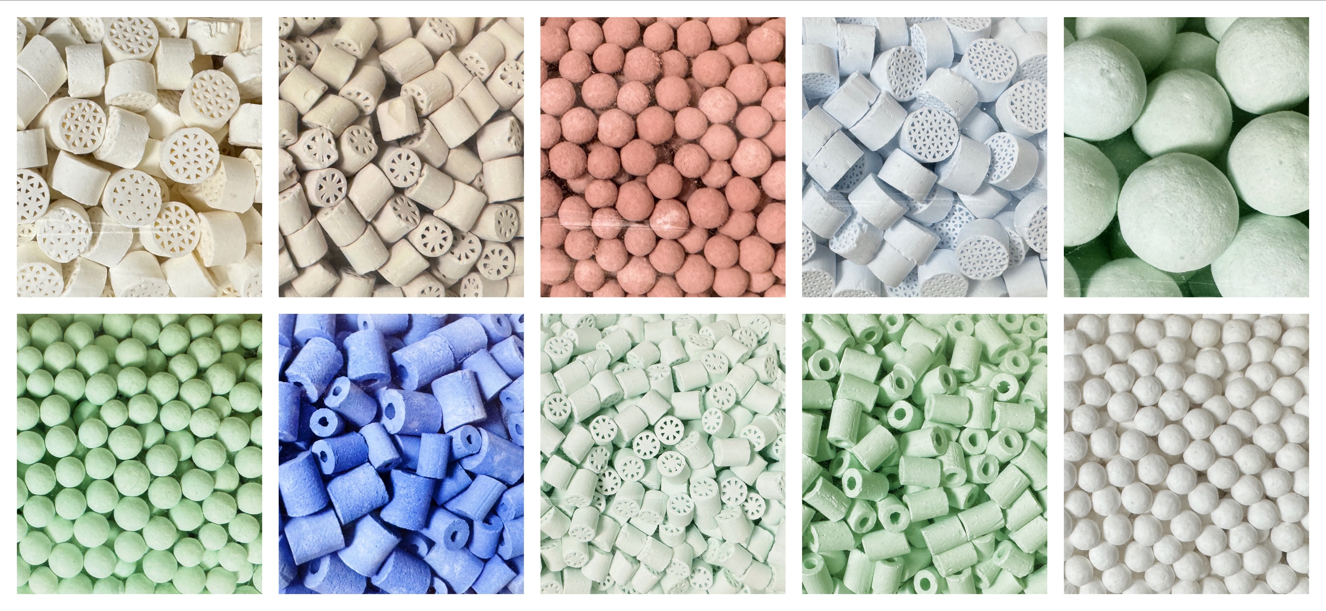 Spherical, Impeller-shaped, Cylindrical, Porous ball, Trilobe, Quatrefoil, Solid Extrudate, Honeycomb etc.